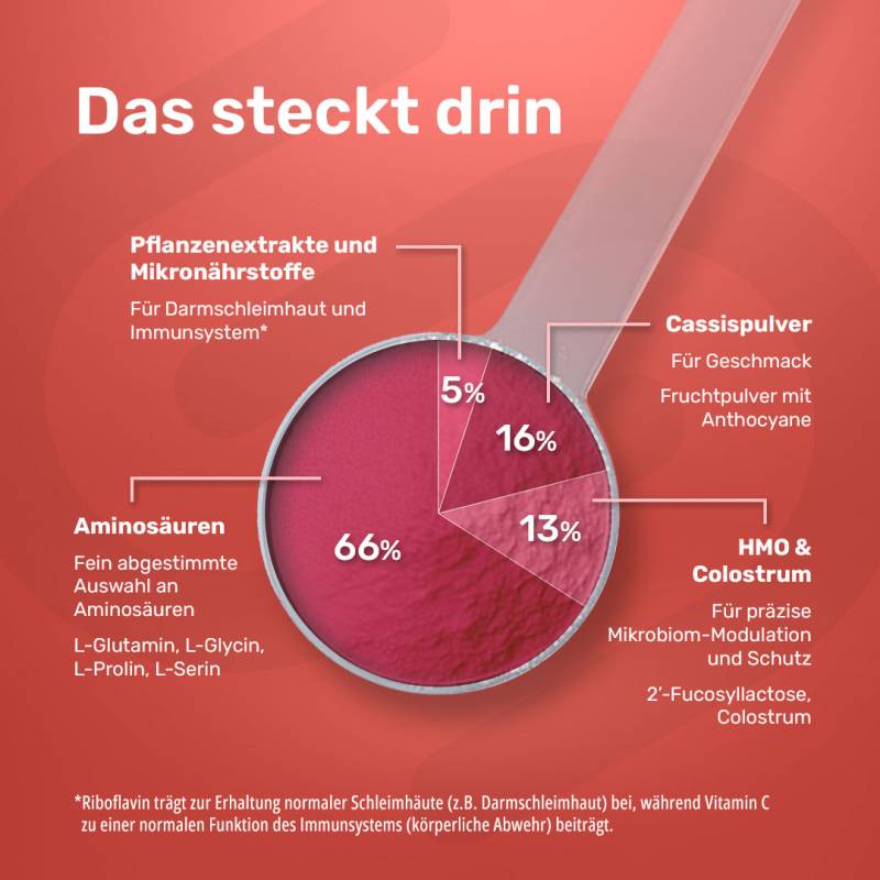 Zutaten: L-Glutamin, Fruchtpulver Cassis, 2’-Fucosyllactose, Colostrum, L-Glycin, L-Prolin, L-Serin, Heidelbeerextrakt, Calciumascorbat, L-Cystein HCl, Aloe Vera Extrakt, Riboflavin.