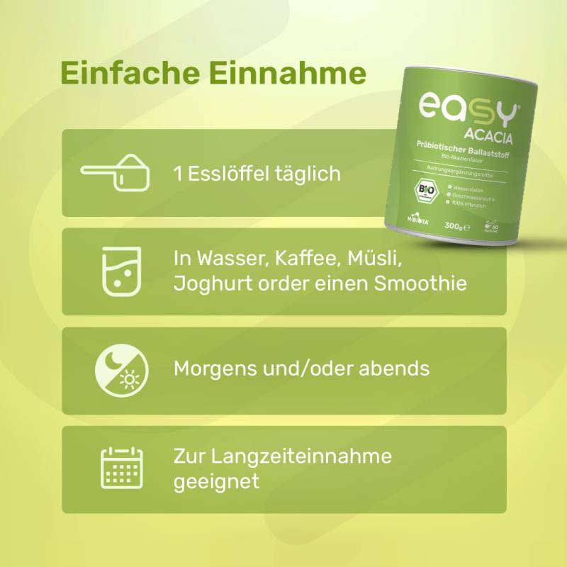 Ein- bis zweimal täglich einen gestrichenen Esslöffel (ca. 5 g easyACACIA® = 4,25 g lösliche Ballaststoffe) in Wasser, Müsli, Joghurt oder einem Smoothie auflösen und einnehmen. Bei Bedarf die Dosis schrittweise auf bis zu drei Esslöffel pro Tag (insgesamt 15 g) oder gemäß ärztlicher Empfehlung erhöhen.