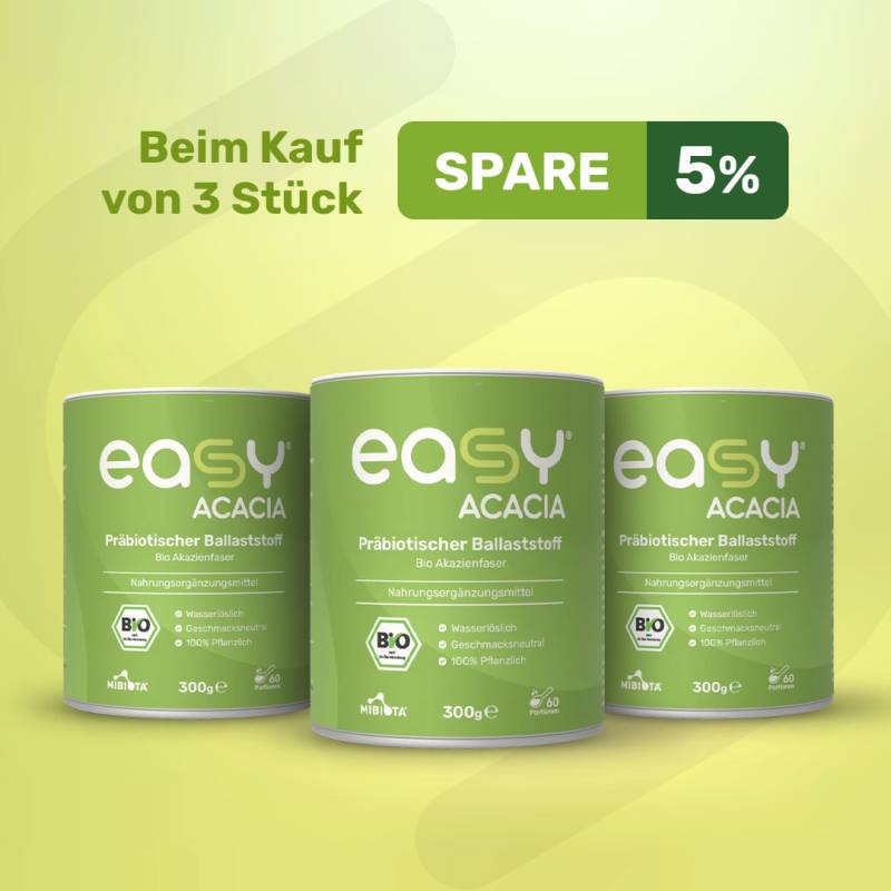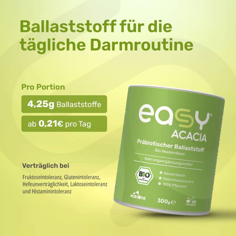 easyACACIA® liefert mit einer Tagesdosis von 10g bereits rund ein Drittel der empfohlenen täglichen Menge an Ballaststoffen – dank eines besonders hohen Ballaststoffgehalts von 80–90 %. Die enthaltene Akazienfaser besteht fast ausschließlich aus löslichen Ballaststoffen, insbesondere Arabinogalactane, und liefert damit Nahrung für die Darmbakterien.