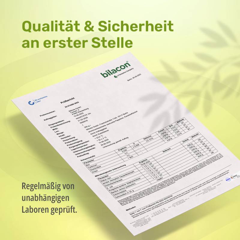 Die angegebene empfohlene tägliche Verzehrmenge darf nicht überschritten werden. Nahrungsergänzungsmittel sind kein Ersatz für eine abwechslungsreiche und ausgewogene Ernährung