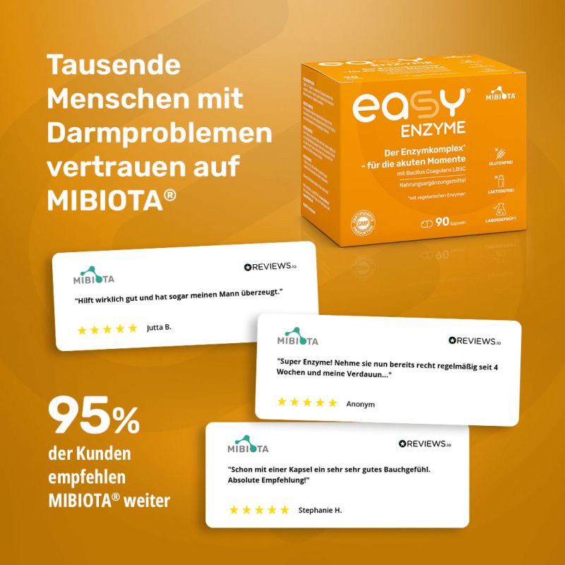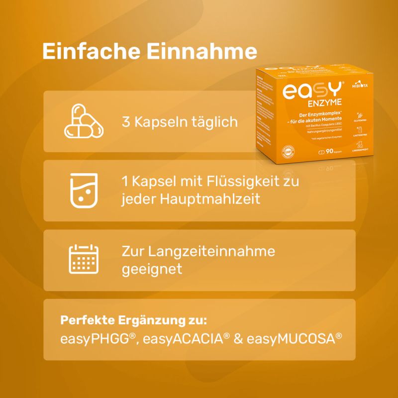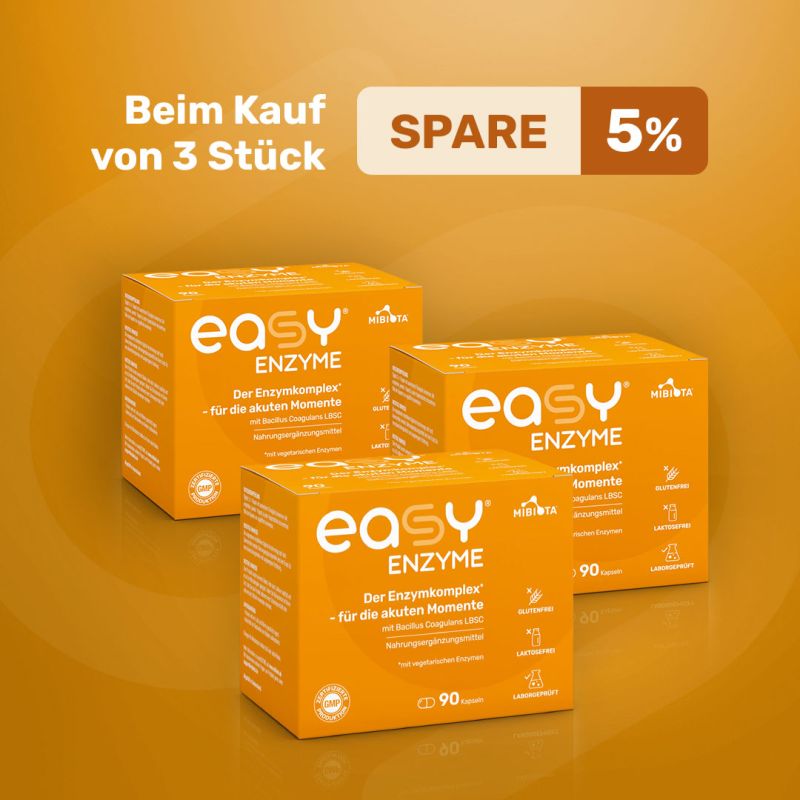 Zudem ist die Ergänzung mit easyENZYME® sinnvoll, wenn bestimmte Enzyme fehlen oder von der Bauchspeicheldrüse nicht mehr ausreichend produziert werden, was zu einer unzureichenden Verwertung der aufgenommenen Nahrung führen kann. Auch Stress oder eine unausgewogene Ernährung können das Verdauungssystem − und damit den Enzymhaushalt − aus dem Gleichgewicht bringen.