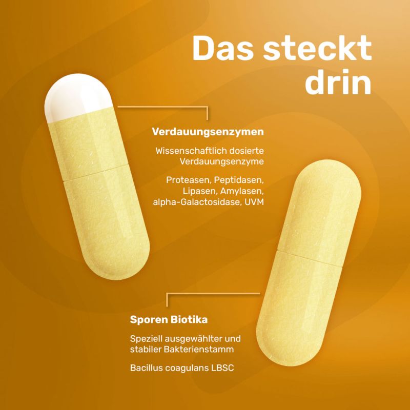 Zutaten:Enzym- und Bakterienkomplex (Amylase, Protease I, Lipase, Protease II, Laktase, Bacillus coagulans LBSC, α-Galactosidase, Glucoamylase, Cellulase, Hemicellulase, Bromelain, Papain, Protease III, Peptidase, Xylanase, Invertase, Pektinase, Phytase, Diastase), Kapselhülle (Hydroxypropylmethylcellulose), Maltodextrin*.