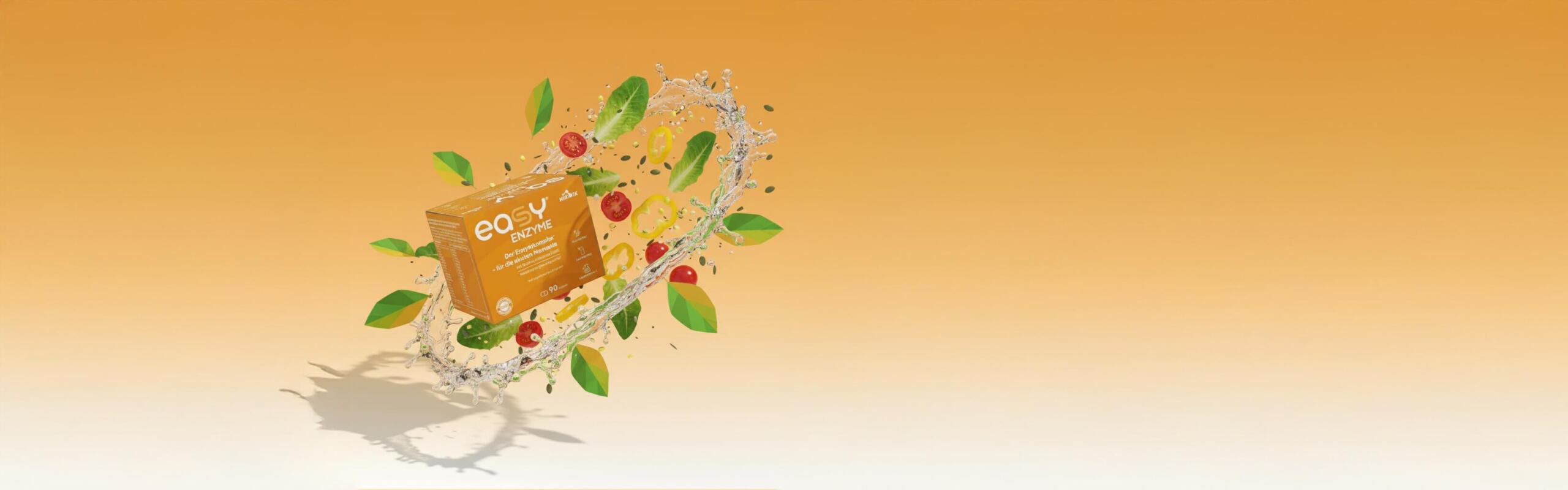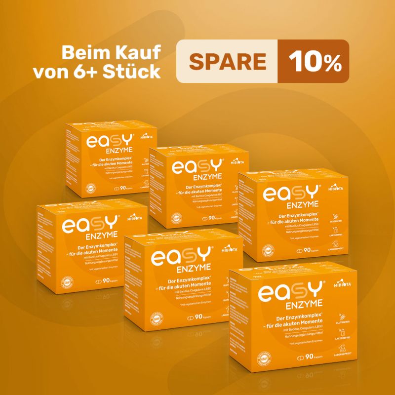 Zudem ist die Ergänzung mit easyENZYME® sinnvoll, wenn bestimmte Enzyme fehlen oder von der Bauchspeicheldrüse nicht mehr ausreichend produziert werden, was zu einer unzureichenden Verwertung der aufgenommenen Nahrung führen kann. Auch Stress oder eine unausgewogene Ernährung können das Verdauungssystem − und damit den Enzymhaushalt − aus dem Gleichgewicht bringen.